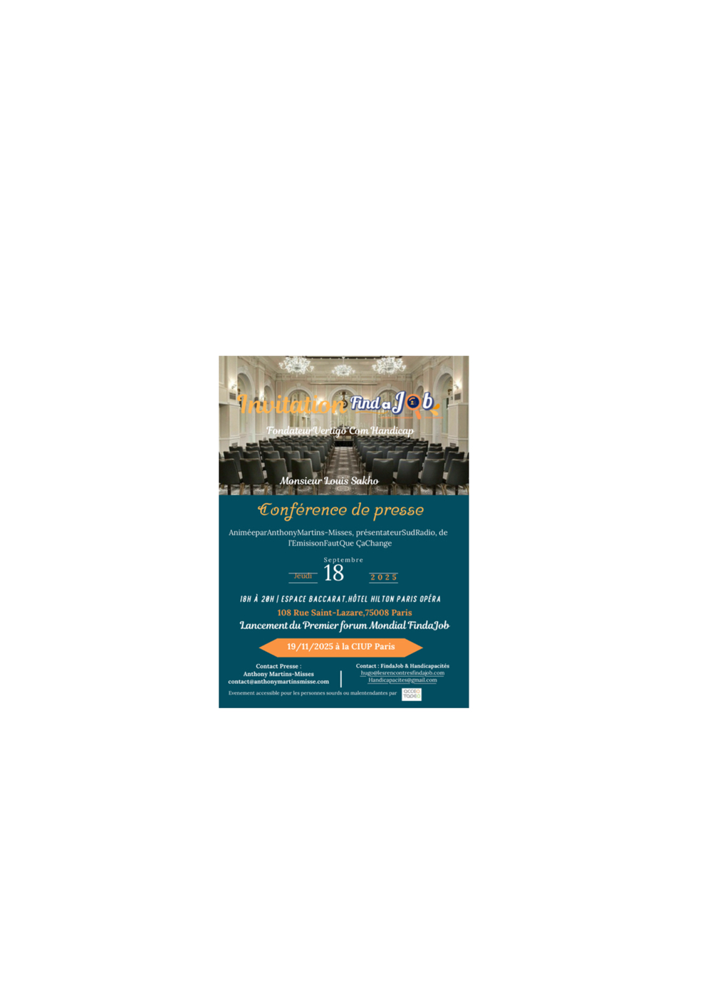 Vertigo Com’ Handicap a eu le plaisir d’être présent à la conférence de presse officielle annonçant le lancement du Premier Forum Mondial FindaJob – Handicap, Sport & Emploi, qui s’est tenue le 18 septembre 2025 dans le cadre prestigieux de l’Hôtel Hilton Paris.